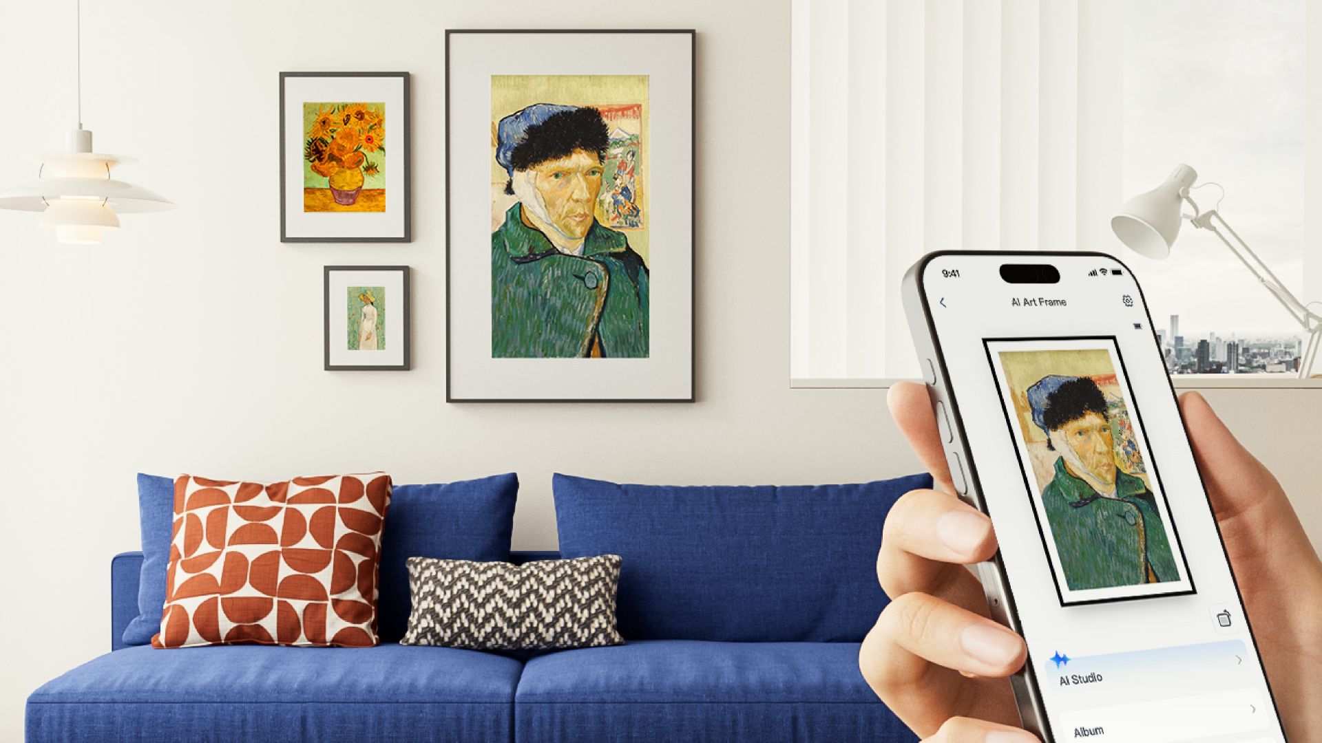 Smartphone-App steuert digitalen Bilderrahmen mit Van-Gogh-Kunst im modernen Wohnzimmer über AI Art Frame.
