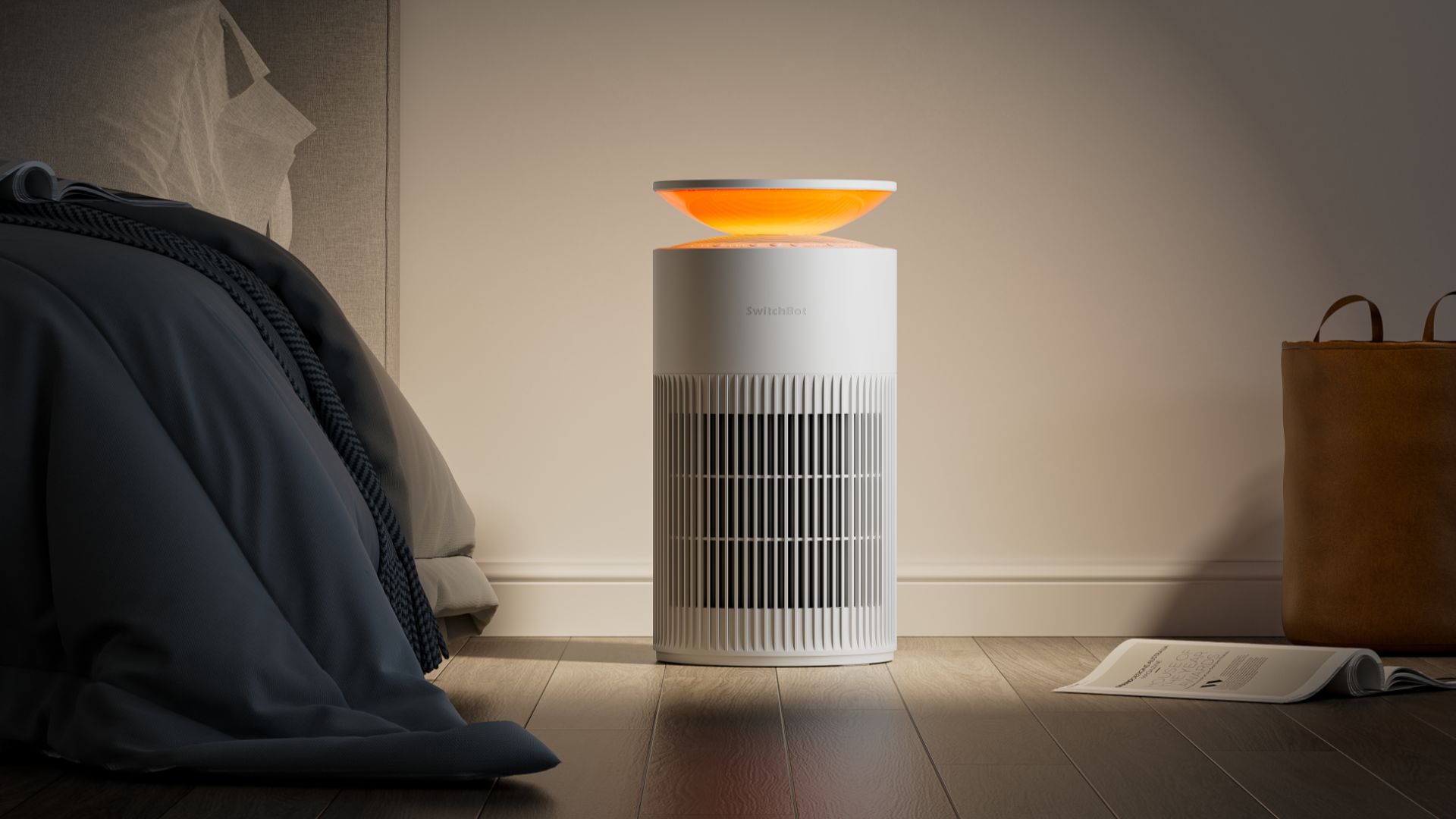 SwitchBot Luftreiniger mit Air Quality Light zeigt Luftqualität im Schlafzimmer mit orangefarbener LED-Anzeige.