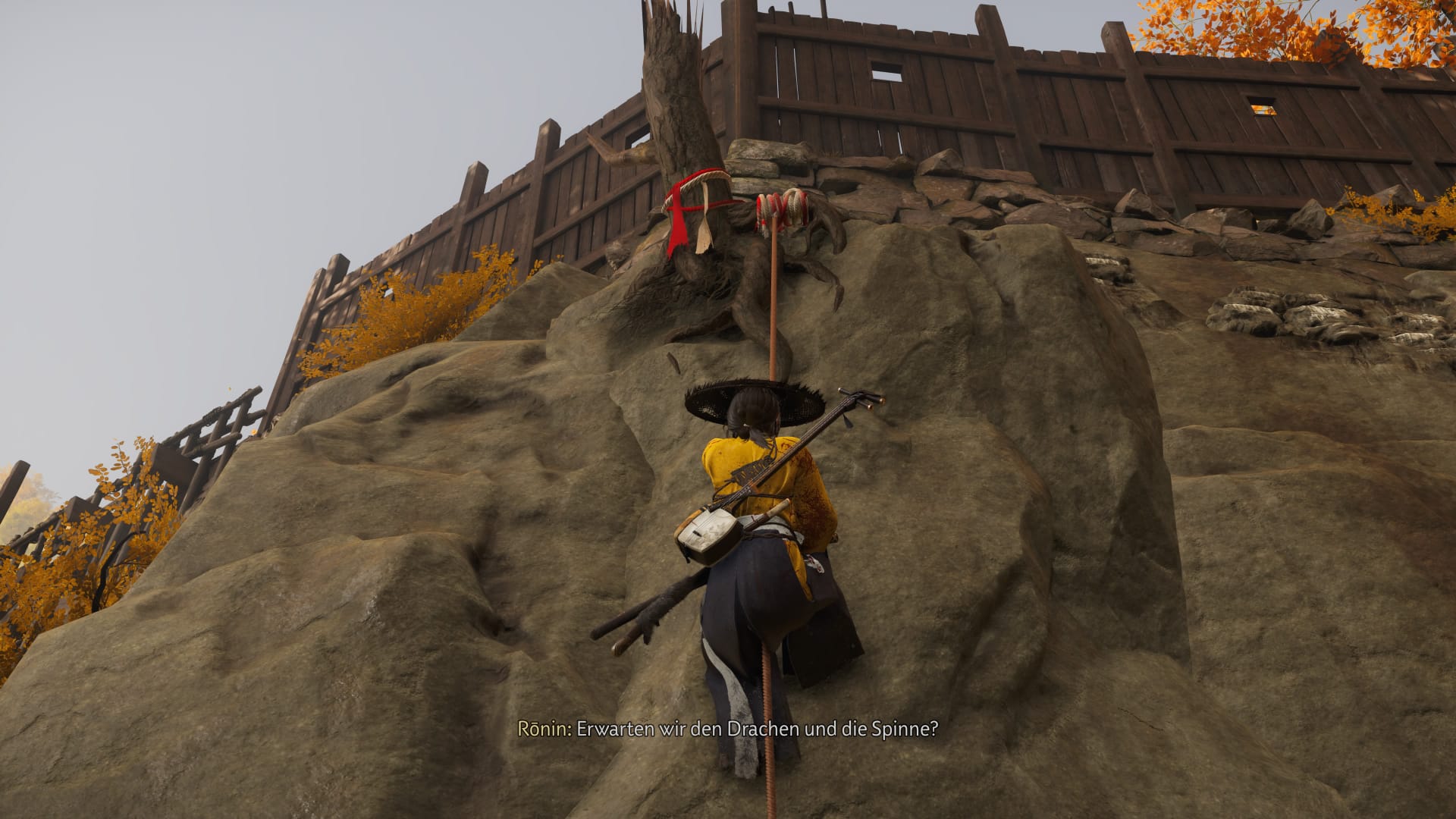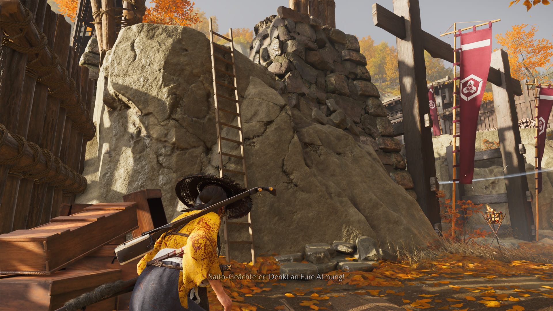 Das Haupttor der Festung sieht zwar verlockend aus, ist jedoch verschlossen. Euer Weg führt euch stattdessen links entlang, die Felsformationen hoch. Oben angekommen, seht ihr ein Holzgerüst, auf das ihr springen könnt. Verschafft euch von dort mithilfe des Fernglases einen Überblick über den Hof. Haltet entsprechend nach Saito Ausschau und plant euren Weg.