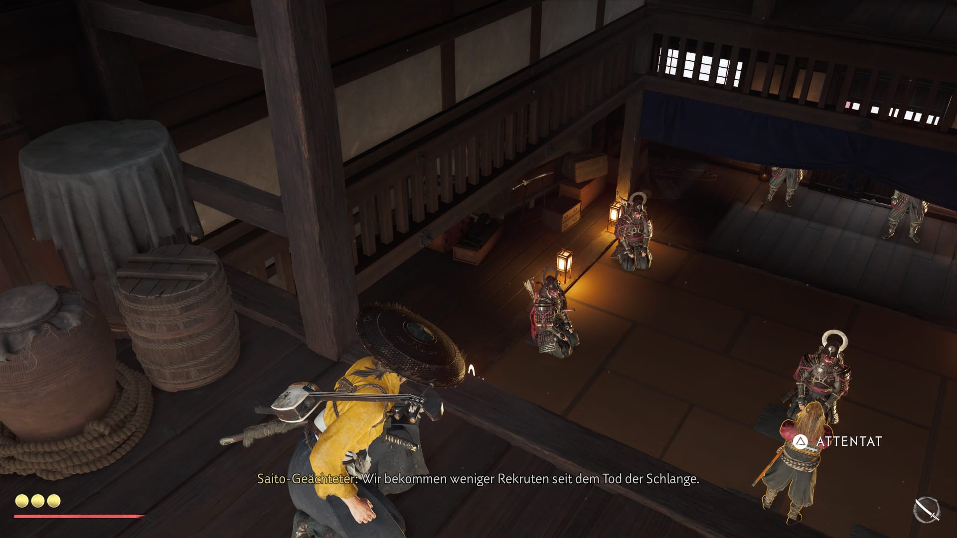 Ganz oben angekommen, entdeckt ihr ein offenes Fenster. Klettert hinein und ihr steht auf einer Empore mit perfektem Blick auf Saito und seine Wachen. Ihr könnt Saito zwar erst belauschen, müsst ihn jedoch früher oder später angreifen.