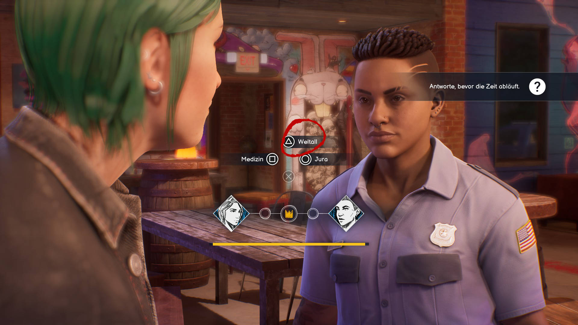 Noelles erste Frage dreht sich um eure Fachrichtung. Aus den angebotenen Optionen solltet ihr unbedingt „Weltall“ auswählen. Der Grund dafür ist simpel: Chloe kann sich damit auf Dr. Murphy beziehen, was die Antwort glaubwürdig macht. Wählt ihr stattdessen zum Beispiel „Medizin“, weist Noelle euch direkt darauf hin, dass die Uni gar keine Medizinabteilung hat. Damit würde der erste Punkt an sie gehen und ihr geratet unnötig unter Druck.