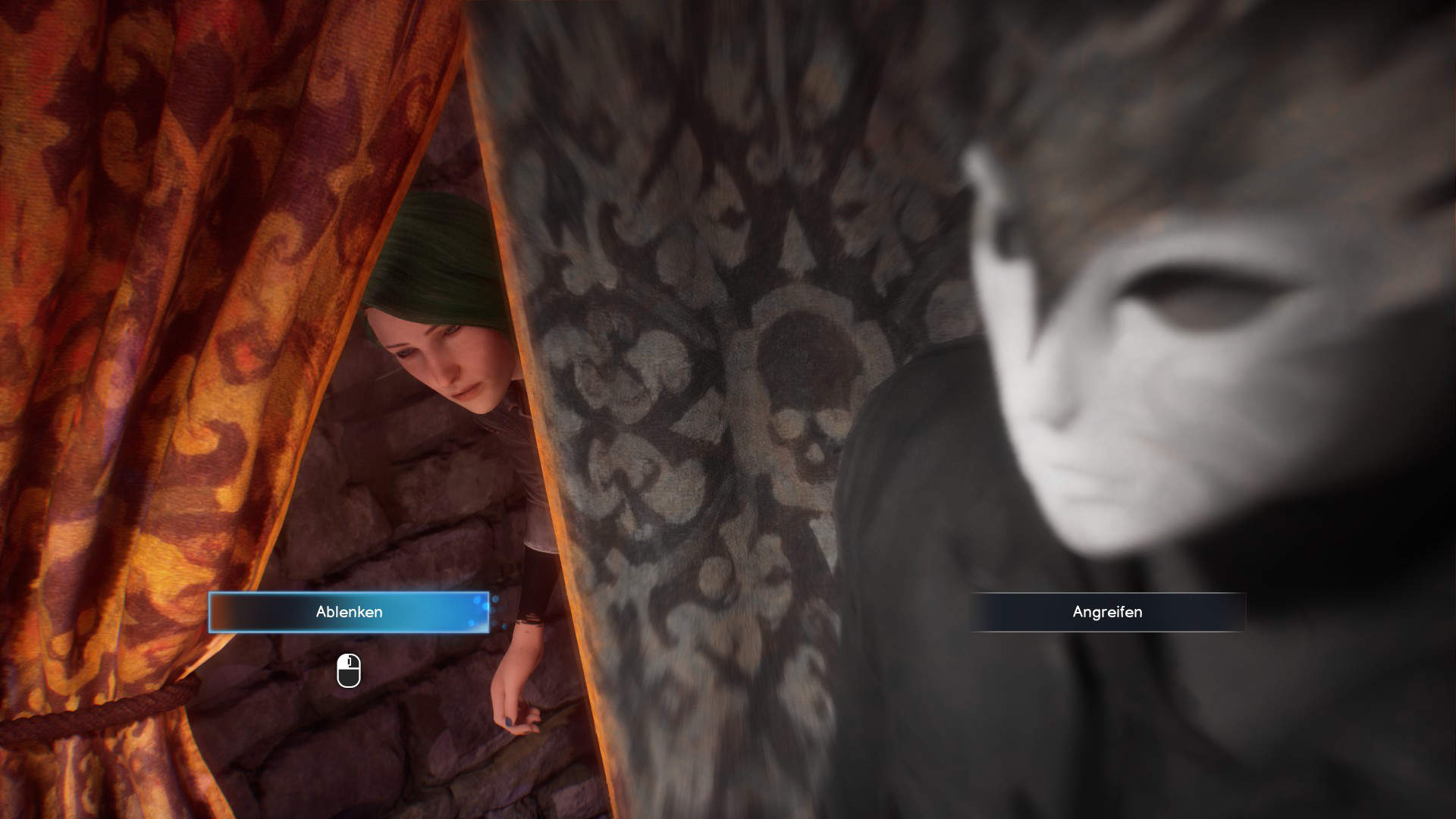 Während ihr euch noch im Geheimraum befindet, hört ihr Schritte. Ein maskierter Mann betritt den Keller. Chloe versteckt sich hinter einem Vorhang, während der Eindringling den geöffneten Geheimraum untersucht und mit einem Hammer Ziegelsteine aus der Wand schlägt. Kurz darauf betritt auch Reggie den Keller. Der Maskierte kehrt zurück, und ihr müsst entscheiden, wie Chloe reagiert.