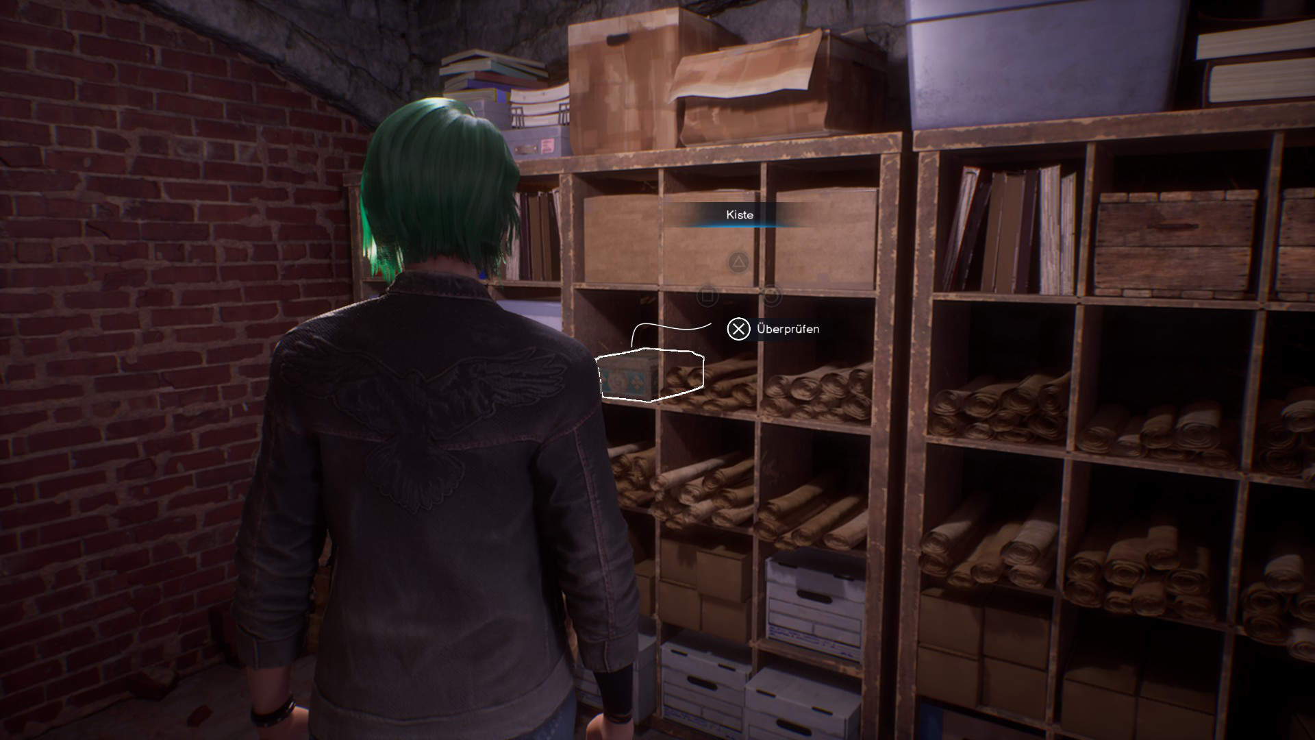 Hinter dem Geheimgang gelangt ihr in einen kleineren Raum mit Schriftrollen und gelagerten Gegenständen. Eure Aufgabe lautet nun, nach Hinweisen zu suchen. Geht nach rechts zum Regal und nehmt die dort platzierte Schachtel.