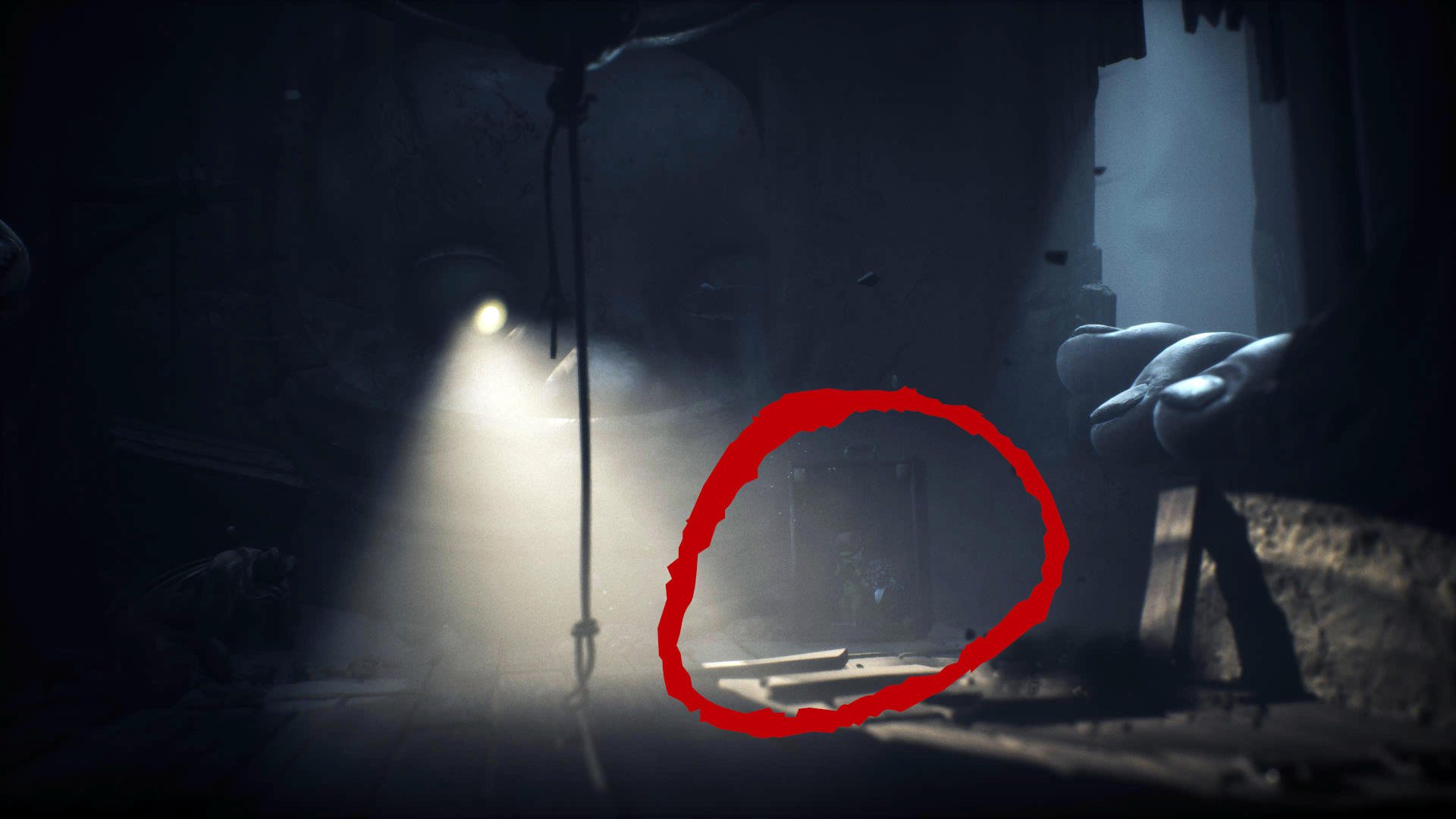 Kurz nach der sechsten Begegnung öffnet ihr eine kleine Luke und hört das Baby schreien – rennt sofort los! Sprintet, was das Zeug hält, und hüpft über die kleine Schlucht in den Durchgang. Versteckt euch hinter der Rassel, bis das Baby diese hochhebt. Das ist eure Chance, euch hinter der Kiste links zu verkriechen. Bleibt dort, bis die Krähen das Baby verscheuchen.