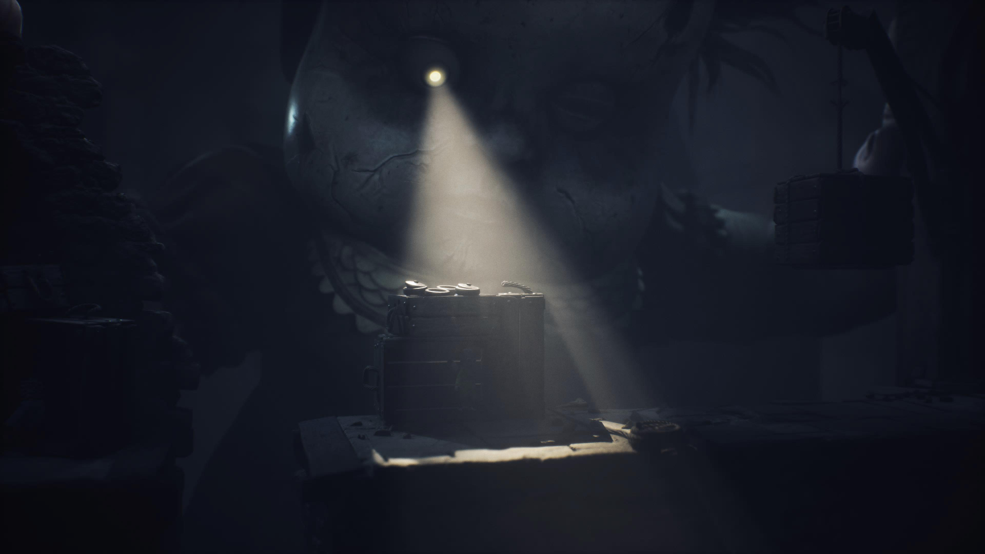 Beim vierten Aufeinandertreffen müsst ihr wieder dem Lichtstrahl des Riesenbabys ausweichen. Versteckt euch hinter der ersten Kiste und wartet, bis der Lichtkegel bei euch ist. Hört auf die Geräusche! Kurz, bevor das Baby den Lichtkegel bewegt, brummt es kurz. Sprintet sofort zur nächsten Kiste und wartet an deren rechtem Ende. Rauscht der Lichtkegel an euch vorbei, sprintet zur dreieckigen Kiste. Von dort aus erreicht ihr eine Klappe in der Wand, durch die ihr entkommen könnt.