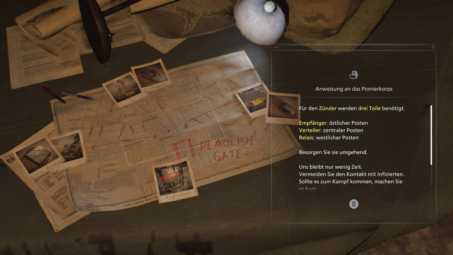 Das provisorische Lager erkennt ihr an einem großen blauen Zelt und mehreren Containern. Geht zunächst hinter das Zelt und aktiviert dort den Generator. Dadurch wird die Stromversorgung wiederhergestellt und eine kurze Szene ausgelöst. Im Inneren des Zelts findet ihr mehrere wichtige Hinweise. Besonders relevant ist ein Dokument mit Anweisungen für ein Pionierteam. Darin wird bestätigt, dass drei Zünderteile im Gebiet verteilt sind.