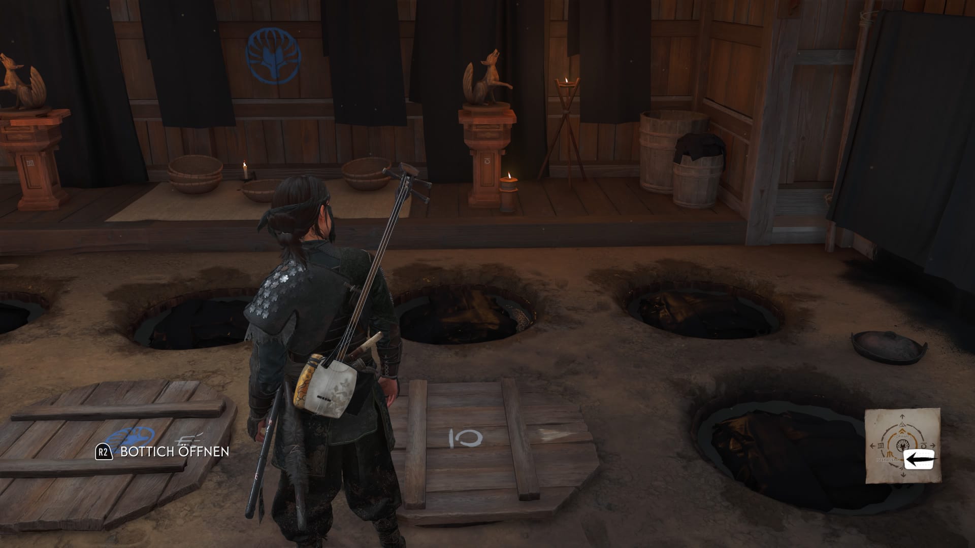 Return to Oyuki at the inn and follow the main story about Chosuke. Then head to the Dye House. There’s another puzzle here. Place the first fox on the left pedestal at the top and rotate the vat cover so the arrow on the square symbol points left. Go right, place the fox on the pedestal, and rotate the circle symbol to the right. Now lift the middle lid to access a tunnel.