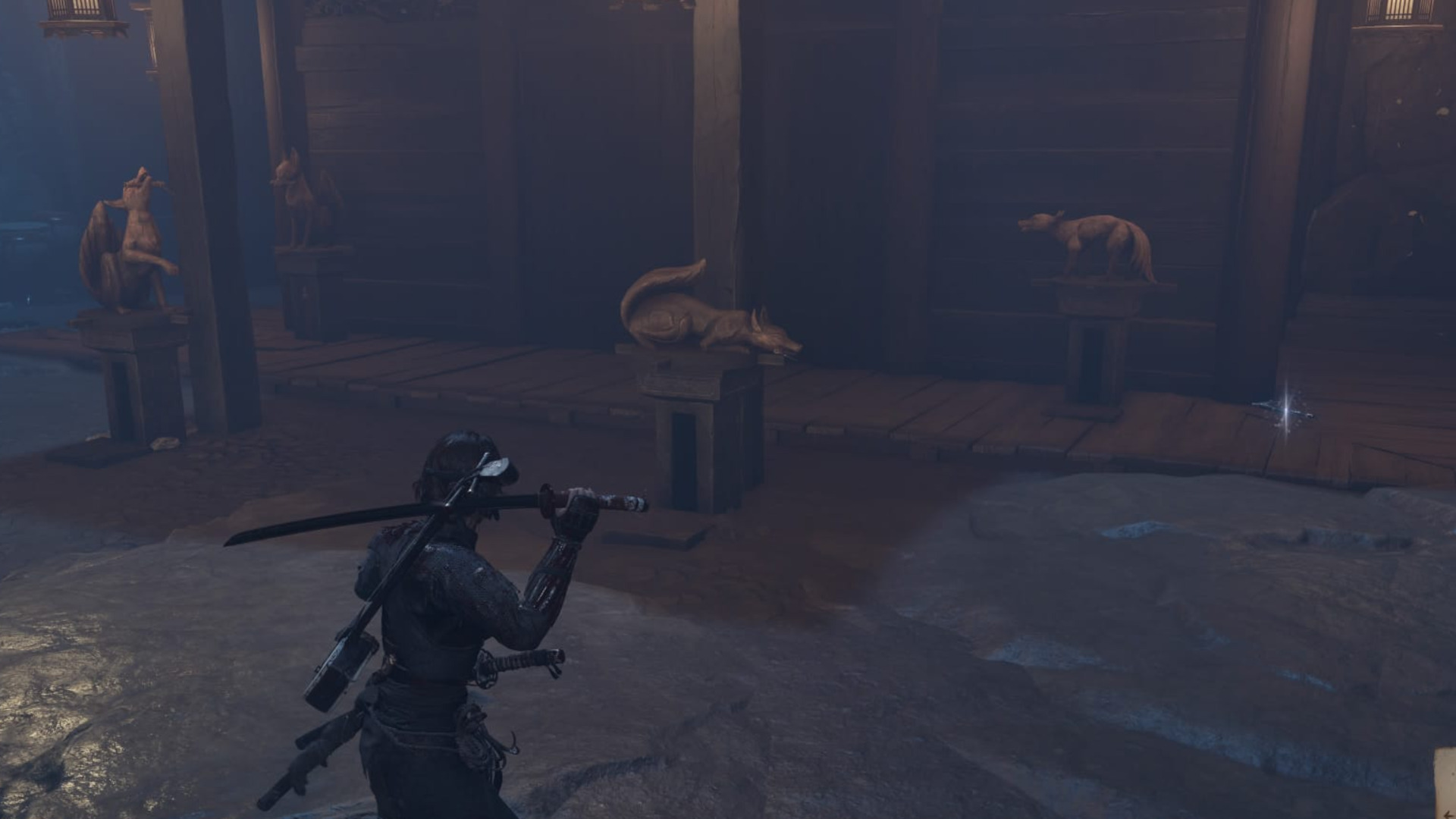 After clearing the enemies, you’ll face the four fox statues again beneath a wooden structure.