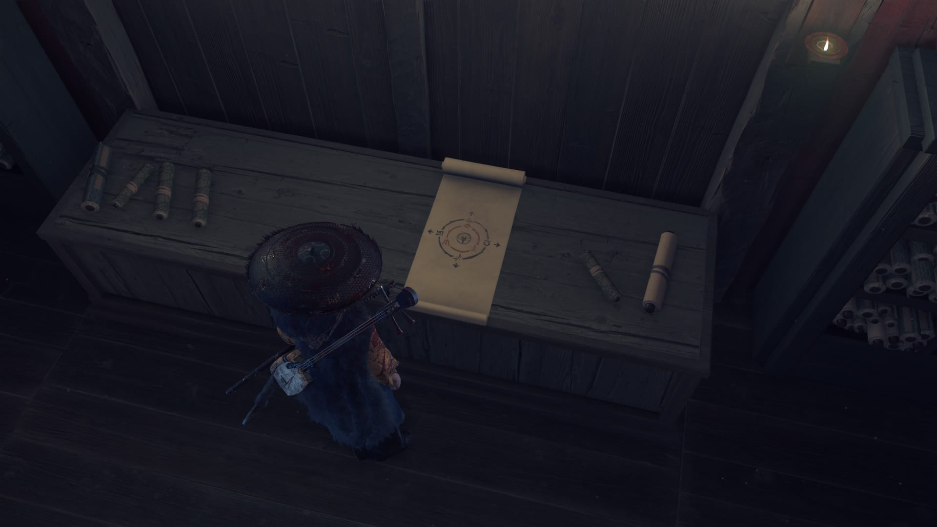 Four fox statues are in front of the building – ignore them for now. Head inside to find a table with a scroll showing several symbols.